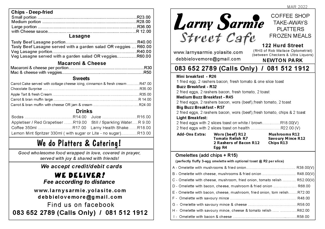 LARNY SARMIE COFFEE SHOP, nestled in Newton Park, Gqeberha, offers a delightful culinary escape that balances authenticity with affordability. This cozy, tucked-away spot has earned praise for its impeccable quality and warm service, making it a true hidden gem.